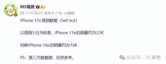 首销5天,iPhone17e的销量已经达到2.3万台。