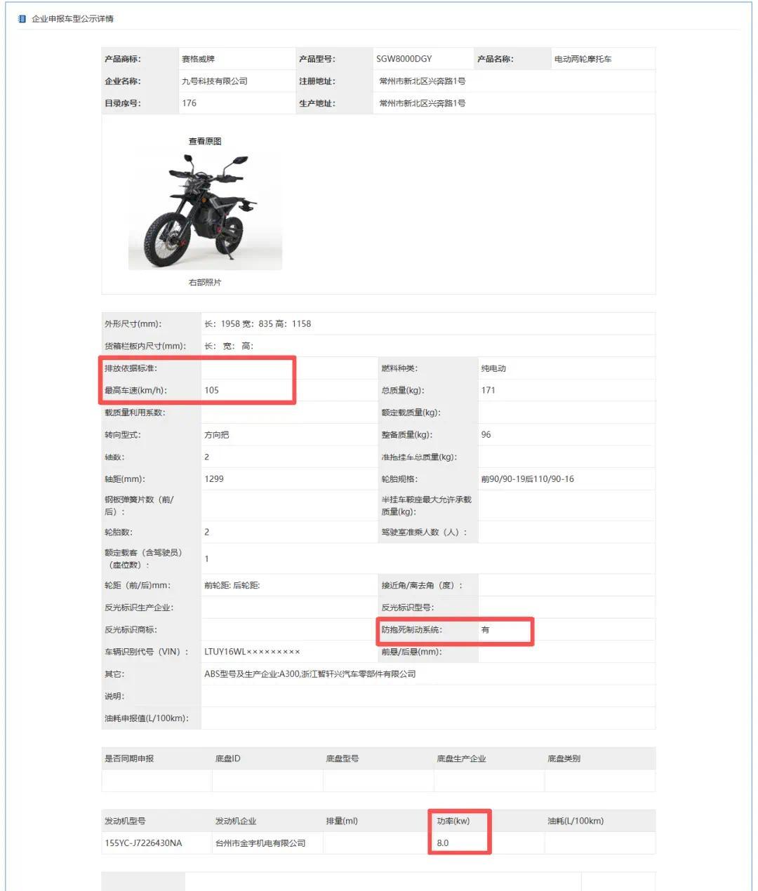 来自工信部目录资料显示,这款型号为SGW8000DGY的越野电摩搭载的是功率为8.0kW的中置电机,车辆最高时速可达105km/h。电池应为铅酸电池配置(国外发布的Xaber300配备74V、5.4kWh容量电池组,标准模式下综合续航约75km),使用前90/90-19、后110/90-16轮胎,并配有 ABS。