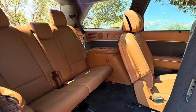 内饰变化很明显,中控采用两块12.3英寸曲面屏连接起来,仪表盘和中控屏合成一体,方向盘做成平底样式,跟揽胜的设计很像,车门把手模仿捷尼赛思游艇造型,显得有点讲究,木纹饰板、氛围灯和缝线皮质大面积铺开,物理按键基本取消,所有功能都整合进屏幕里,座椅提供7座、8座或9座可选,第二排是独立电动座椅,支持按摩、滑动和角度调节,第三排可以向前移动,后备箱最大容积达到615升,还能通过中控屏一键控制后排功能。