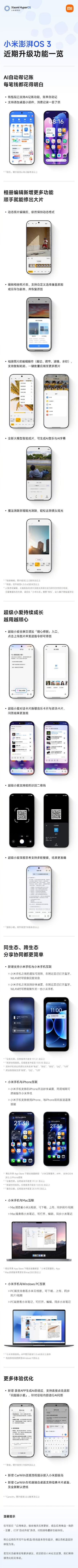 【CNMO科技消息】近日,小米官方发布小米澎湃OS 3近期功能更新说明,宣布在AI智能、相册编辑、语音助手及多设备协同等方面推出多项新特性。此次更新聚焦于提升用户日常使用效率与跨生态交互体验,进一步强化其“AI+万物互联”的系统理念。