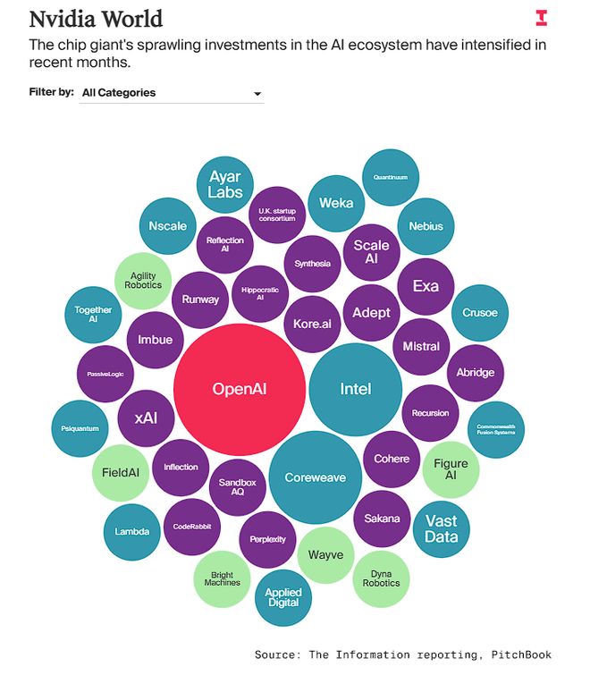 英伟达的投资已经变得如此庞大和广泛,涉及数据中心、模型制作和其他多个类别的众多公司,以至于它开始变成类似于人工智能领域的“政府”。这种比喻并非夸张,而是对其在AI生态系统中影响力的真实写照。